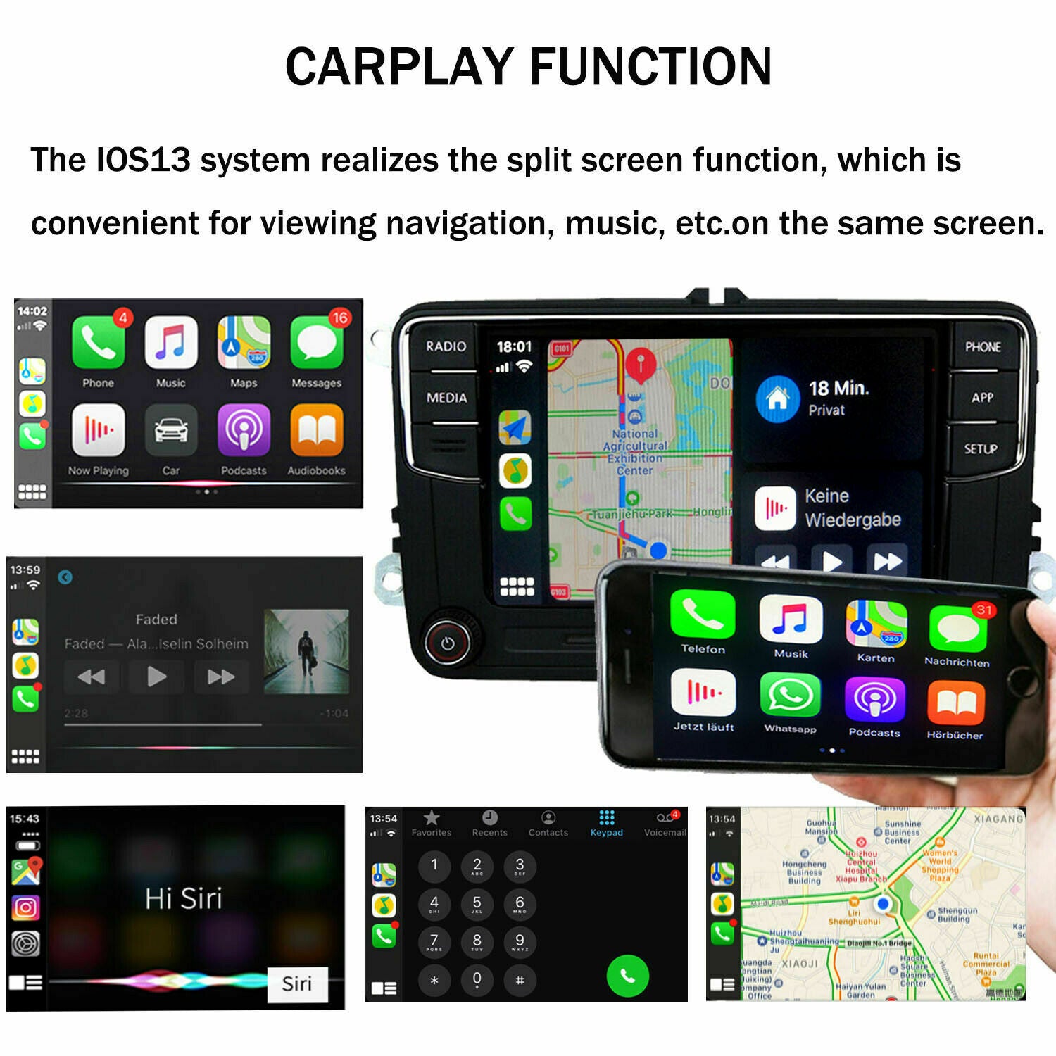 The radio supports Carplay function, just for Iphone, the system must be IOS 10 and also the higher. The IOS13 system realizes the split screen function, which is convenient for viewing navigation, music, etc.on the same screen.